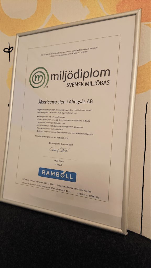 Åkericentralen är miljödiplomerade enligt Svensk Miljöbas sedan 2008 och har även i år fått ett förnyat diplom för årets miljöarbete.